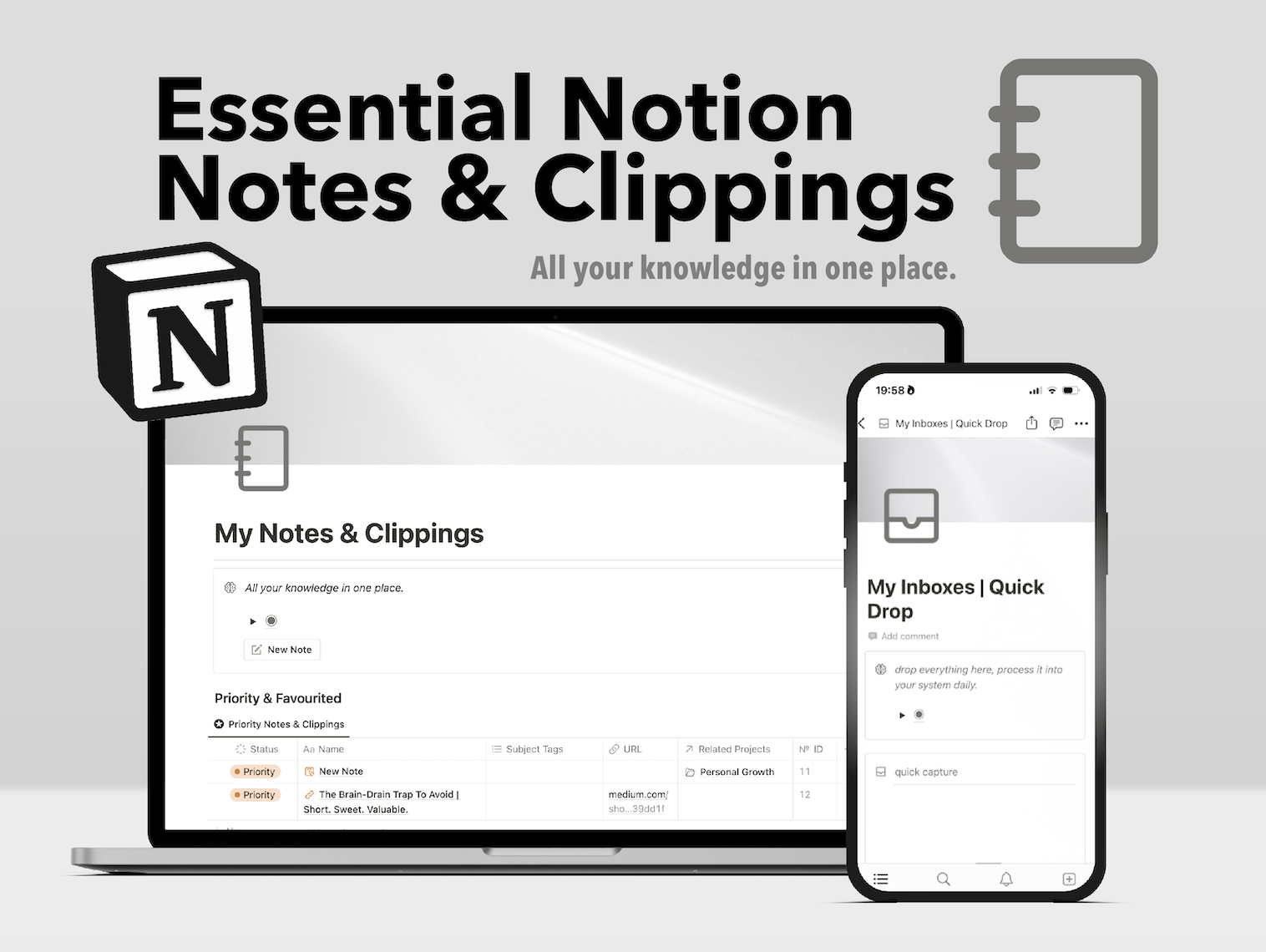 Manage all your notes, clippings & Project Notebooks in one system: the cornerstone of a Notion Second Brain. + Option to integrated Prompted Stoic Journal!